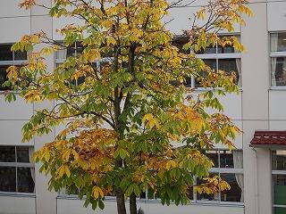 ↑ 今日の給食は、ハムステーキ、ごぼうサラダ、マカロニスープです。噛むことにより、脳は刺激され活性化します。今日のごぼうサラダは、かみかみメニューになっています。ごぼうサラダには、小松菜、にんじん、トウモロコシが入っていて、彩りもよく、ごぼうとよく混ざるように同じ大きさに切ってあります。子供たちは、よく噛んで、野菜独自の味を味わい、静かに食べていました。中庭のトチノ木も徐々に紅葉が進んでいます。町の中の木々も、紅葉真っ盛り、秋を感じますね。