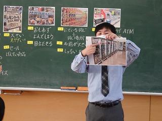 ↑3の3 社会 スーパーマーケットでは、お客さんに喜んでもらえる工夫がたくさんありました。今日は、コンビニエンスストアには、同じような工夫があるのか、考えました。資料から、お店の工夫をたくさん探し、友達と伝え合うことができました。今日は、石川県教育委員会のマネジメントサポーターの先生に授業を見ていただきました。子供たちが集中して一生懸命考える姿をたくさんほめてくださいました。
