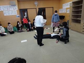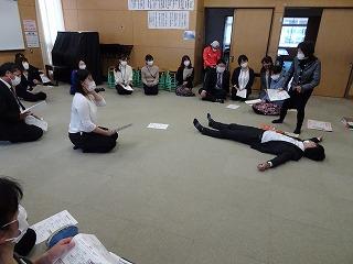 ↑ 当事者の容態を素早く的確に確認し、救急車を要請する人、AEDを持ってくる人、周りの人を誘導する人、職員室へ呼びに行く人等、すばやく役割を支持します。胸骨圧迫心マッサージとAEDは訓練用の簡易計測器です。実際にやってみたり、緊急時応急処置の手順を確認したりしました。