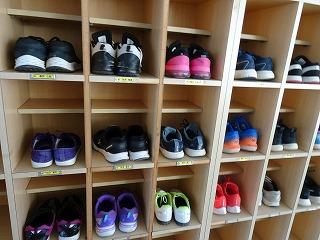 ↑1年生の下足箱と6年生の下足箱、1年から6年まで、しっかりそろえて入れられています。下足をきちんとそろえると、学習用具も丁寧に整頓できるようになります。とても大切なことです。