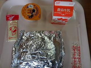 ↑今日は、簡易給食で、ハンバーガーでした。鶏肉と豚肉のハンバーグのほか、かぼちゃやブロッコリーも入っている栄養バランスの取れたハンバーガーです。一つ一つ、アルミホイルに包んで食べやすくしてくださいました。