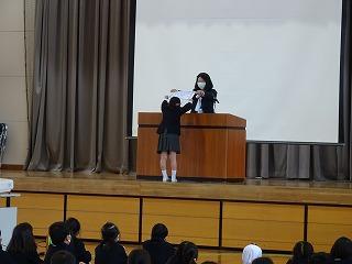 ↓ 次は、社会を明るくする標語の表彰です。元気の出る素敵な標語を作り、表彰されました。