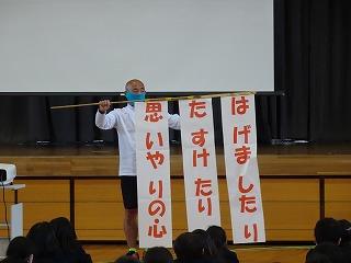 ↓ 生活目標のお話です。「困っている人を励ましたり、助けたりして、条南小学校に思いやりの心を広めよう」