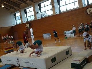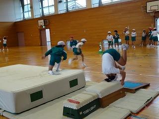 ↑1の1 体育 こんな風に、柔らかく着地しましょう。そして、ポーズですよ!↓運動することが楽しくて楽しくてしょがない!という感じです。元気いっぱい「ハムスター跳び」を楽しんで、運動能力を鍛えていました。
