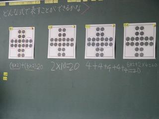 ↑ドットの数え方を考え、式に表しました。ここから、分配法則の計算の決まりを導いていきます。