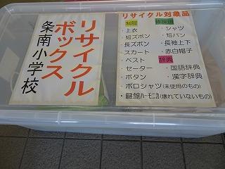 ↑明日、11月6日まで、条南小玄関前に制服、体操服などのリサイクルボックスを設置してあります。リサイクルにご協力お願いします。