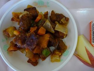 ↑今日の給食です。わかめごはん、豚肉とさつまいものケチャップからめ、ワンタンスープ、りんごです。豚肉とさつまいもがケチャップ味になっているので、子供たちは大好きな味付けだろうなあと思いました。今日もとてもおいしくいただきました。