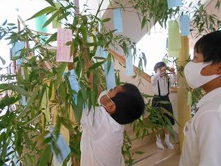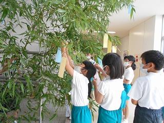 明日は、七夕です。立派な笹を岡本さんとPTA会長さんのご厚意で、学校に届けていただきました。ありがとうございます。昼休みには、全校のみんなで短冊に願いを書き、笹に飾ることができました。明日の七夕は、雲の上で、おり姫様とひこ星が出会っていることでしょう。星に願いを込めて、雲の上の世界に思いを馳せてみましょう。