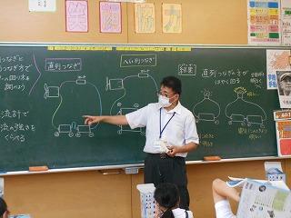 ↑4年3組理科 プロペラをもっと速く回すには、どうしたらよいか考えました。乾電池のつなぎ方によって、プロペラの回る速さが違うことに気づきました。3年生の豆電球の学習を思い出しましたね。