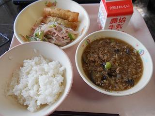 ↑ 今日の給食は中華メニューです。しそで巻いた上げ餃子は、さわやかな味で、パリッとした食感を楽しむことができました。手が込んでいます。バンサンスウ(中華風春雨サラダ)もさっぱりとしていて、食欲がわき、マーボナスは、筍とひき肉も、旬の枝豆も入っていて、これまた、蒸し暑さも、なんのその、元気が出るメニューでした。