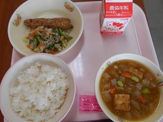 ↑ 今日の給食は中華メニューです。しそで巻いた上げ餃子は、さわやかな味で、パリッとした食感を楽しむことができました。手が込んでいます。バンサンスウ(中華風春雨サラダ)もさっぱりとしていて、食欲がわき、マーボナスは、筍とひき肉も、旬の枝豆も入っていて、これまた、蒸し暑さも、なんのその、元気が出るメニューでした。