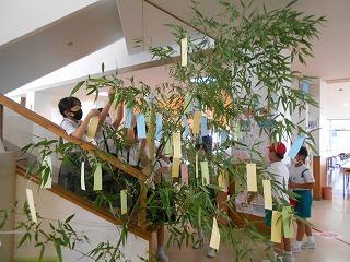 明日は、七夕です。立派な笹を岡本さんとPTA会長さんのご厚意で、学校に届けていただきました。ありがとうございます。昼休みには、全校のみんなで短冊に願いを書き、笹に飾ることができました。明日の七夕は、雲の上で、おり姫様とひこ星が出会っていることでしょう。星に願いを込めて、雲の上の世界に思いを馳せてみましょう。