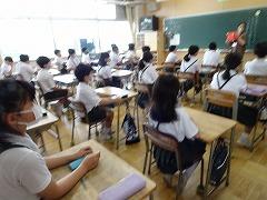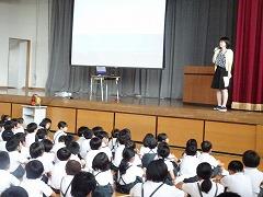 ↓夏休み読書感想文の課題図書について、学校司書、司書教諭による学年ごとのブックトークをしています。本の内容が少しわかると、課題図書に興味を持って読んでみたいという気持ちが高まります。この夏休み、読書に親しんでほしいと思います。