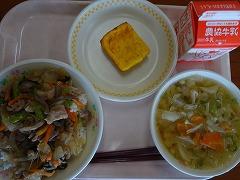 ↓今日の給食は、だし巻き卵、野菜の味噌汁、豚丼でした。夏バテ防止メニューです。たくさんの食材をいただきました。ごちそうさまでした。