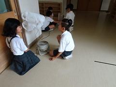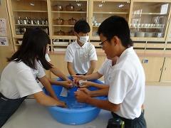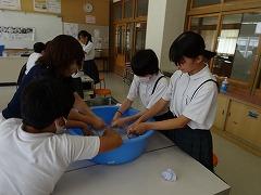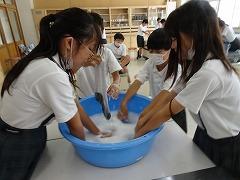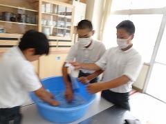 ↓6年家庭科 洗濯の実習です。汚れを落とすには、どのように洗うとよいか、学びました。