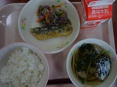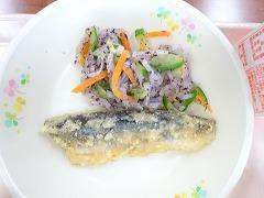 ↓今日の給食です。ごはん、とびうおのから揚げ、ゆかりあえ、さわにわんでした。トビウオ、夏ですね。とても香ばしくおいしく揚がっていました。ごちそうさまでした。