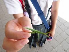 ↓バッタの幼虫を見せてくれました。これから翅ができ、8月ごろには成虫になります。