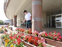 ↓夏の花が玄関を彩っています。環境委員会さんと植えました。毎朝当番が水やりをして、大切に育てています。