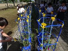 ↓2年生の野菜もたくさん実っています。校務士さんが畑を耕して、畝を作って、つるが巻き付くように「て」をしてくださっています。畑の先生は、肥料をやってくださったり、元気に育つように枝仕立て考えて整理してくださったりしたおかげです。