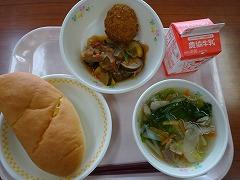 ↓今日の給食です。チーズクッペ、キャベツミンチカツ、レタススープ、ラタツイユでした。レタススープでは野菜をたっぷりいただくことができました。今週もおいしい給食、ごちそうさまでした。