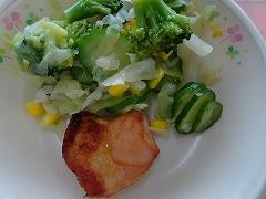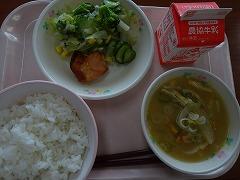 ↓今日の給食は、スパイシ―チキン、グリーンサラダ、かぼちゃの味噌汁でした。