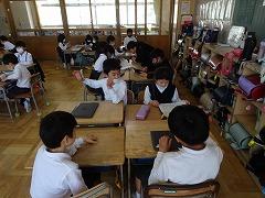 ↓1年生のクロムブックがそろいました。早速、パスワード入力をして使えるようにするために、6年生が力を貸してくれました。