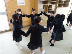 ↓音楽室のズックがそろっています。中をのぞくと、何と1年生!「ひらいた ひらいた」を歌いながらとても上手に踊っています。