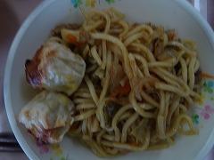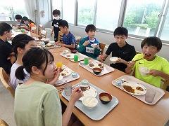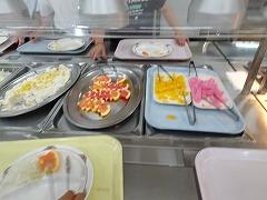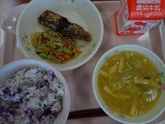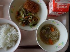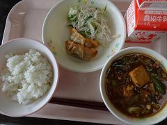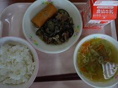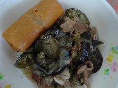 ↓今日の給食は、ごはん、春巻き、ナスのオイスターソース炒め、肉団子スープでした。ナスのおいしい季節になってきましたね。