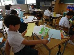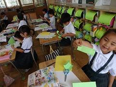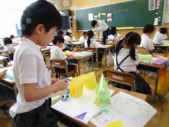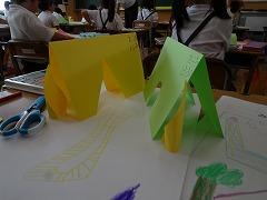 ↓1年生 図工 紙を切って、曲げて、素敵な町を作っています。