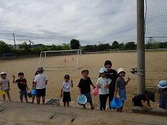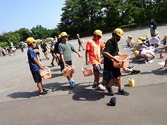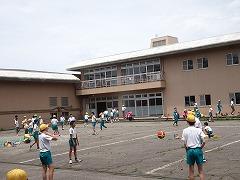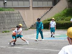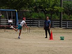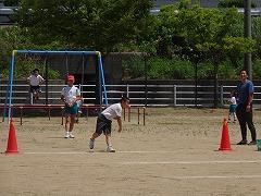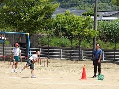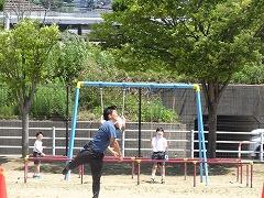 ↓第5投者は、教員チームのホープ5年担任のW先生です。日ごろ鍛えた筋力、今こそ、発揮する場です。場外まで行きそうな勢いです。