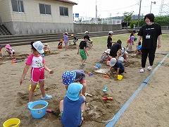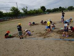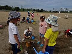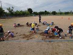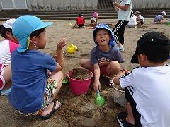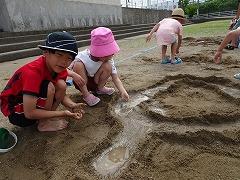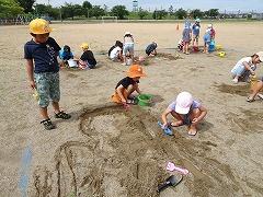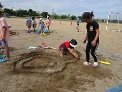 ↓1年生図工 みんなで協力して砂の造形作品を創ります。笑顔で、夢中で、そして、話し合いながら創っていきました。