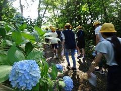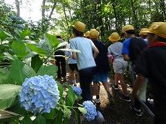 ↑林のアジサイロードを歩き、野外炊飯広場に向かいます。