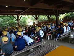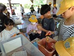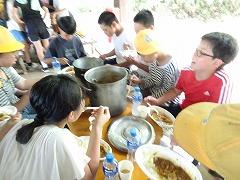 ↓2日目の活動は、野外炊飯で、カレーライスづくりです。かまど係り、薪係、ご飯係、カレー係りなど、分担して、協力して作りました。