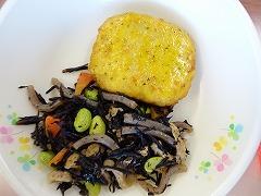↓今日の給食です。今日は、チキンピカタ、ひじきの炒め煮、めった汁でした。チキンピカタは初めてのメニューでした。