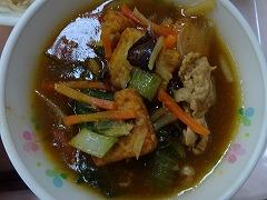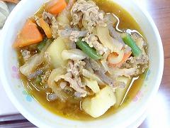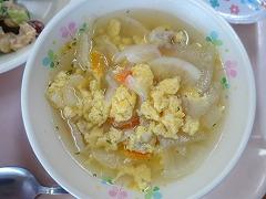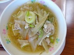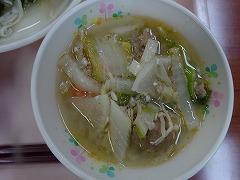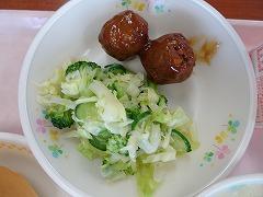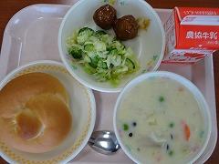 ↓今日の給食です。今日は、ミートボール、グリーンサラダ、かほっくりのチャウダーでした。チャウダーは体が温まるメニューです。