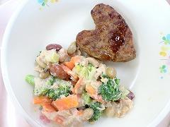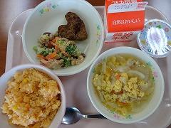 ↑今日の給食は、バレンタイン給食で、チキンライス、ハートのハンバーグ、ツナビーンズサラダ、ふわふわ卵のスープ、ハートのチョコプリンでした。
