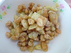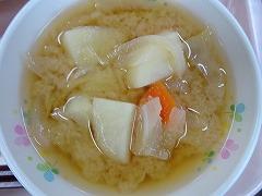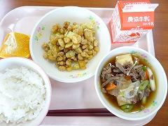 ↑今日の給食は、大豆とじゃがいもの海苔塩、肉豆腐にいよかんでした。牛肉も入っておいしくいただきました。大豆はカミカミメニューで、歯と脳を鍛えるメニューです。