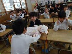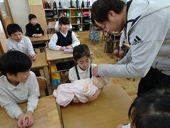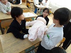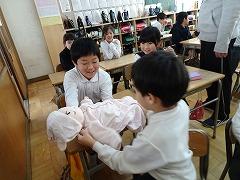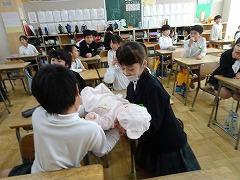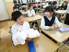 ↓2年生活科 赤ちゃんだったころの自分は、どんな様子だったのでしょう。赤ちゃん人形を抱いて想像しました。緊張しながらも、すぐに笑顔になっていきました。やっぱりかわいいですね。2年生の皆さんもこんな感じだったのでしょうね。