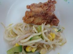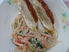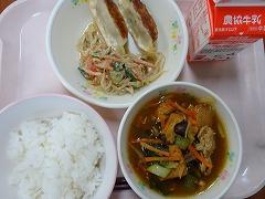 ↓今日の給食は中華料理です。焼き餃子、バンバンジーサラダ、厚揚げの中華風味噌煮でした。