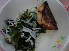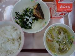 ↓今日の給食です。今日はあじのみりん焼き、もやしときゅうりの酢の物、肉団子の塩なべでした。体に優しい和食メニューです。