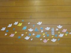 ↓5年生は羽ばたく鳥を6年生に見立てた正面の飾りやプログラム、スローガンを作りました。