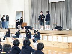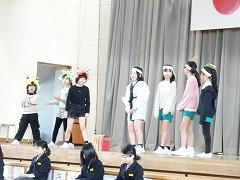 ↓プログラム7番は5年生の出し物「ナイスな6年生へのおくり物」です。1年間、5年生は6年生の素敵なところをよく見ていました。それを自作の劇にしたそうです。みんなを笑わるユーモアたっぷりの劇でした。