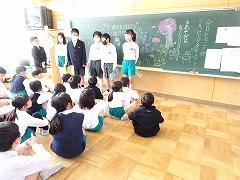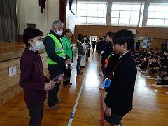 ↓プログラム10番、学校ボランティアの皆様への感謝の言葉とエアリーフローラ―をお渡ししました。6年生から、6年間、登下校の見守りや、図書館の掲示、読み聞かせ等のお礼をお伝えしました。
