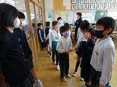 ↑1年生から5年生の思いが詰まったメッセージを、6年生は喜んでくれました。6年生が特にこの1年間、最上級生として委員会や掃除、運動会、縄跳びなど、いろいろなところで優しく、責任感を持って全校のために頑張ってくれたので、あこがれの6年生のために、下級生は心を込めてメッセージを伝えました。