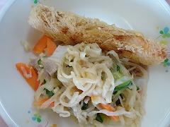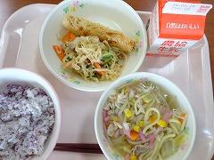 ↓今日の給食です。ゆかりご飯、網目春巻き、切り干し大根の中華和え、五目ラーメンの人気メニュでした。