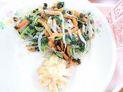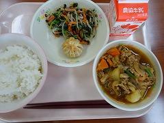 ↓今日の給食です。パオズ、小松菜と海苔のナムル、韓国風肉じゃがでした。肉じゃがは、赤味噌とゴマ油などを加えると、韓国風になるのですね。