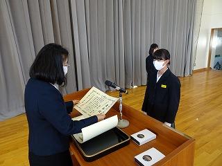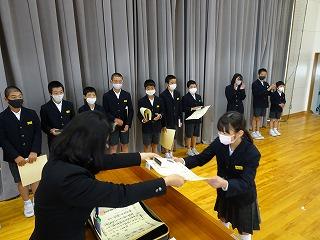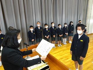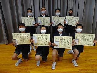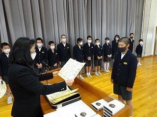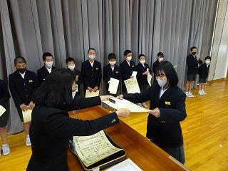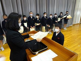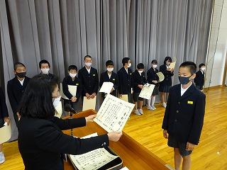 学校外の活動で輝かしい成果を収めた皆さんの表彰式が津幡町役場で行われました。今年度は新型コロナウィルス感染防止のため、一部の受賞者での表彰式でしたが、学校でも表彰式を行いましたのでその様子をお知らせします。今回の受賞を励みにさらなる栄光を目指して頑張ってください。受賞おめでとうございました。