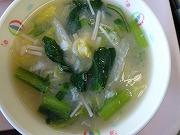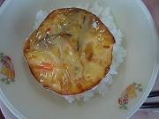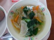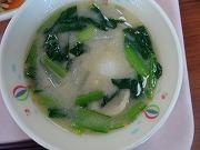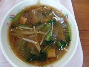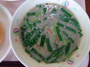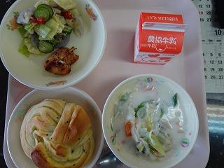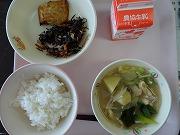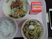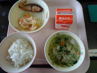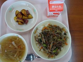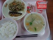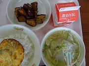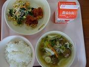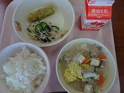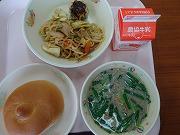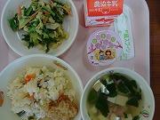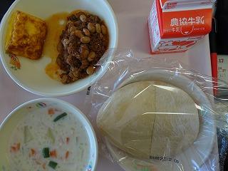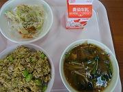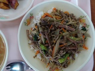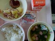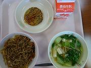 ↑今日は韓国料理の給食です。肉みそ丼に、チヂミにチンゲンサイのスープです。食欲がわく給食でした。