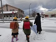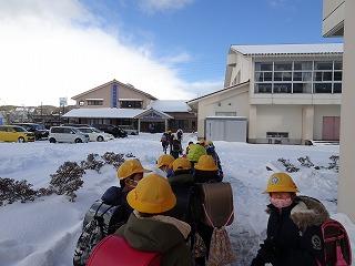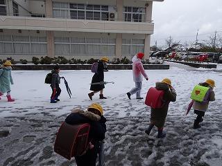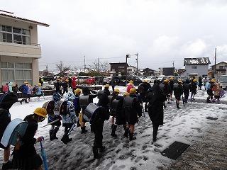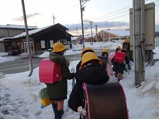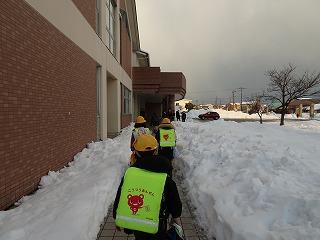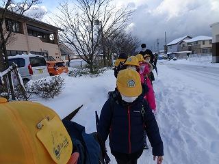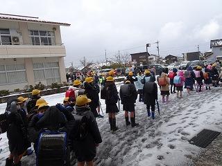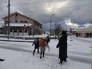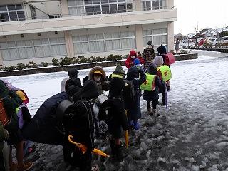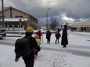 暴風雪による集団下校を実施しました。帽子を押さえ、吹き飛ばされないように踏ん張って歩きました。