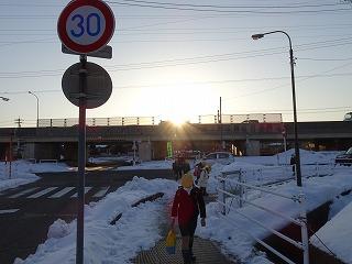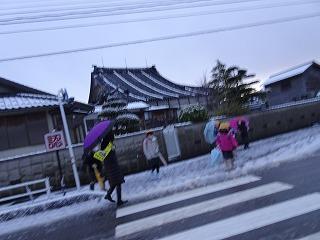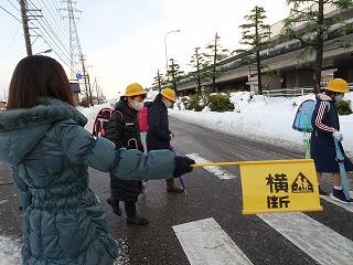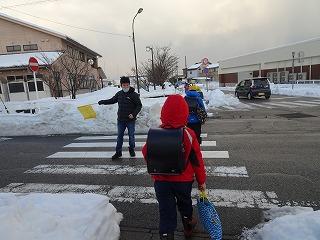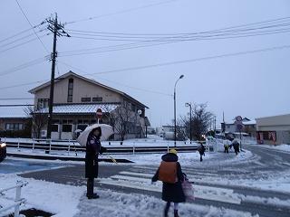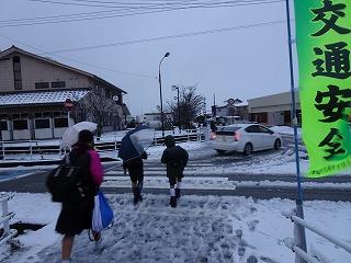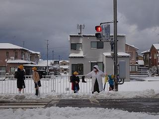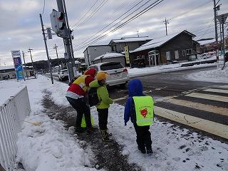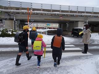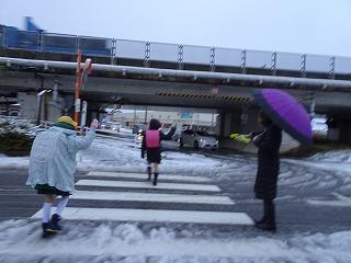 ↓横断歩道は特に滑りやすくなっています。保護者の皆様、寒い中、各ポイントでの安全の見守りをありがとうございます。